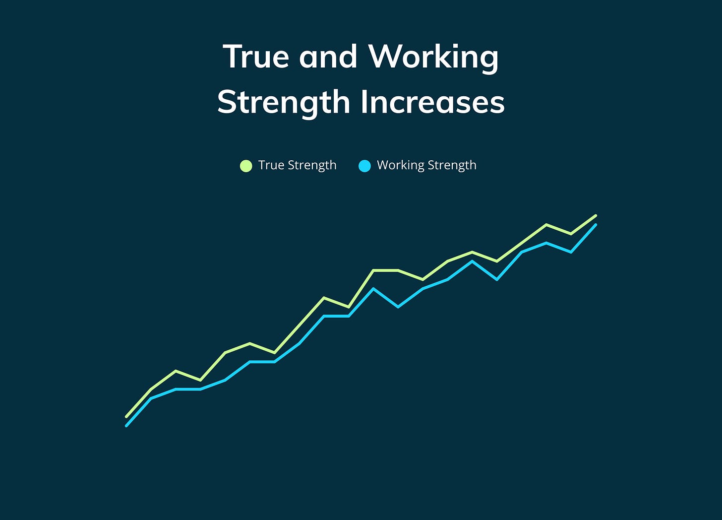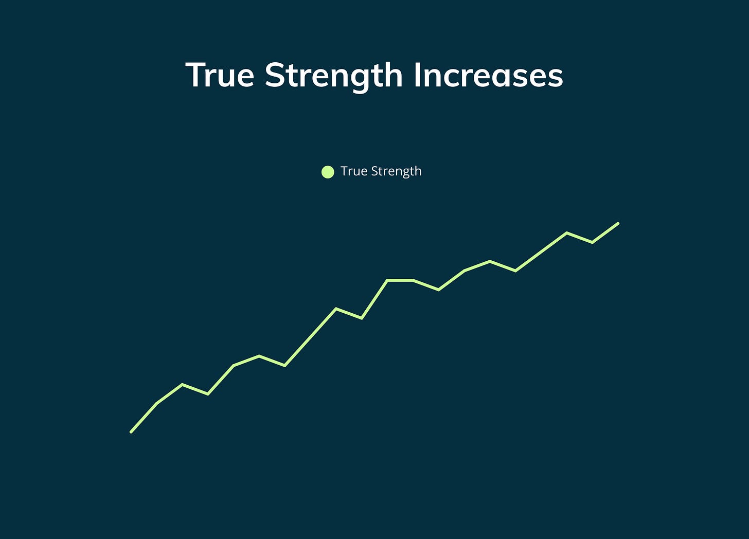 Imagine, as I mentioned before, a broader “true” change in your capacity or strength for an exercise. It is a real number, but you often won’t be able to determine it with complete accuracy. Imagine that number as a jaggedly increasing line like this.